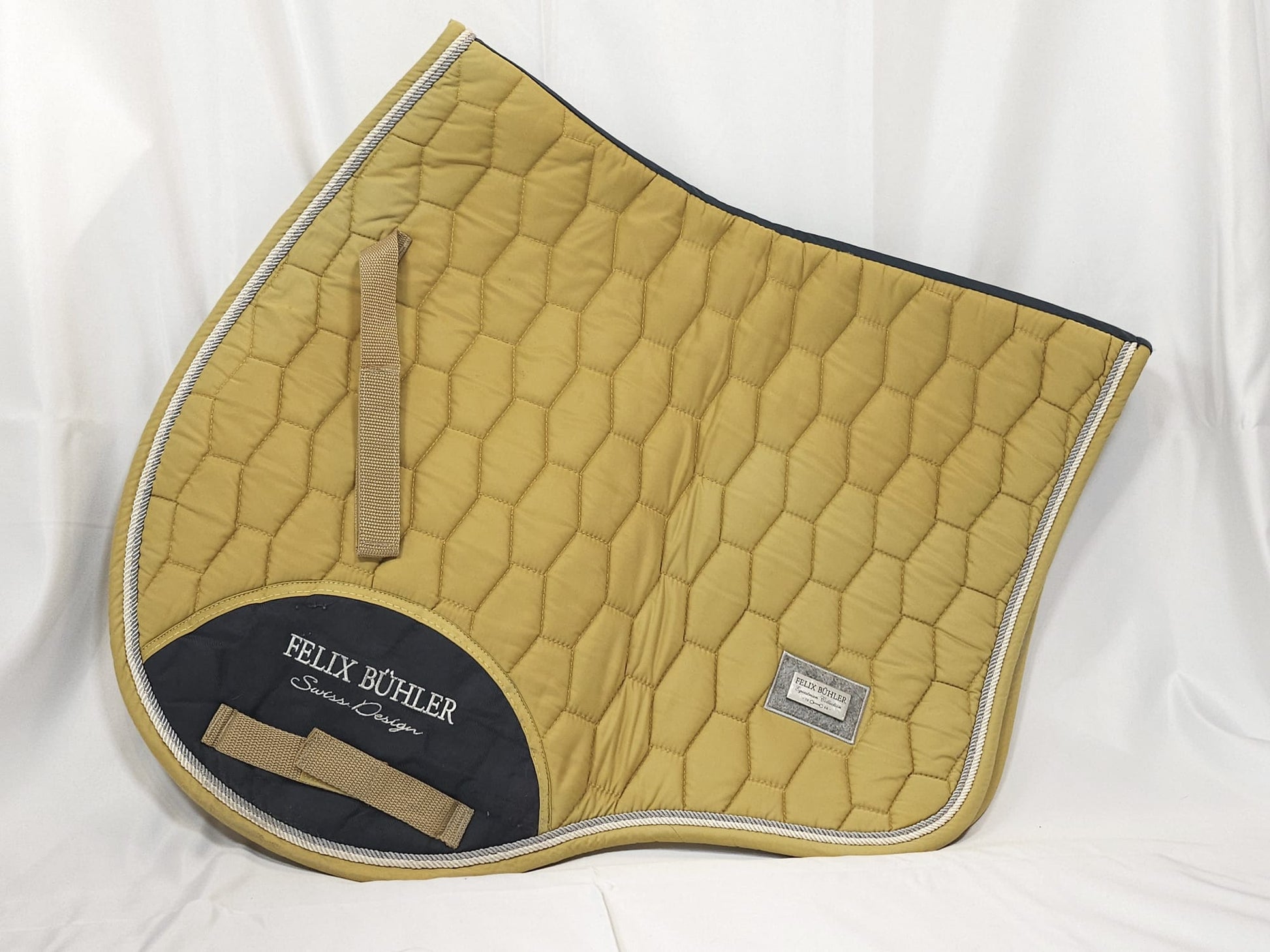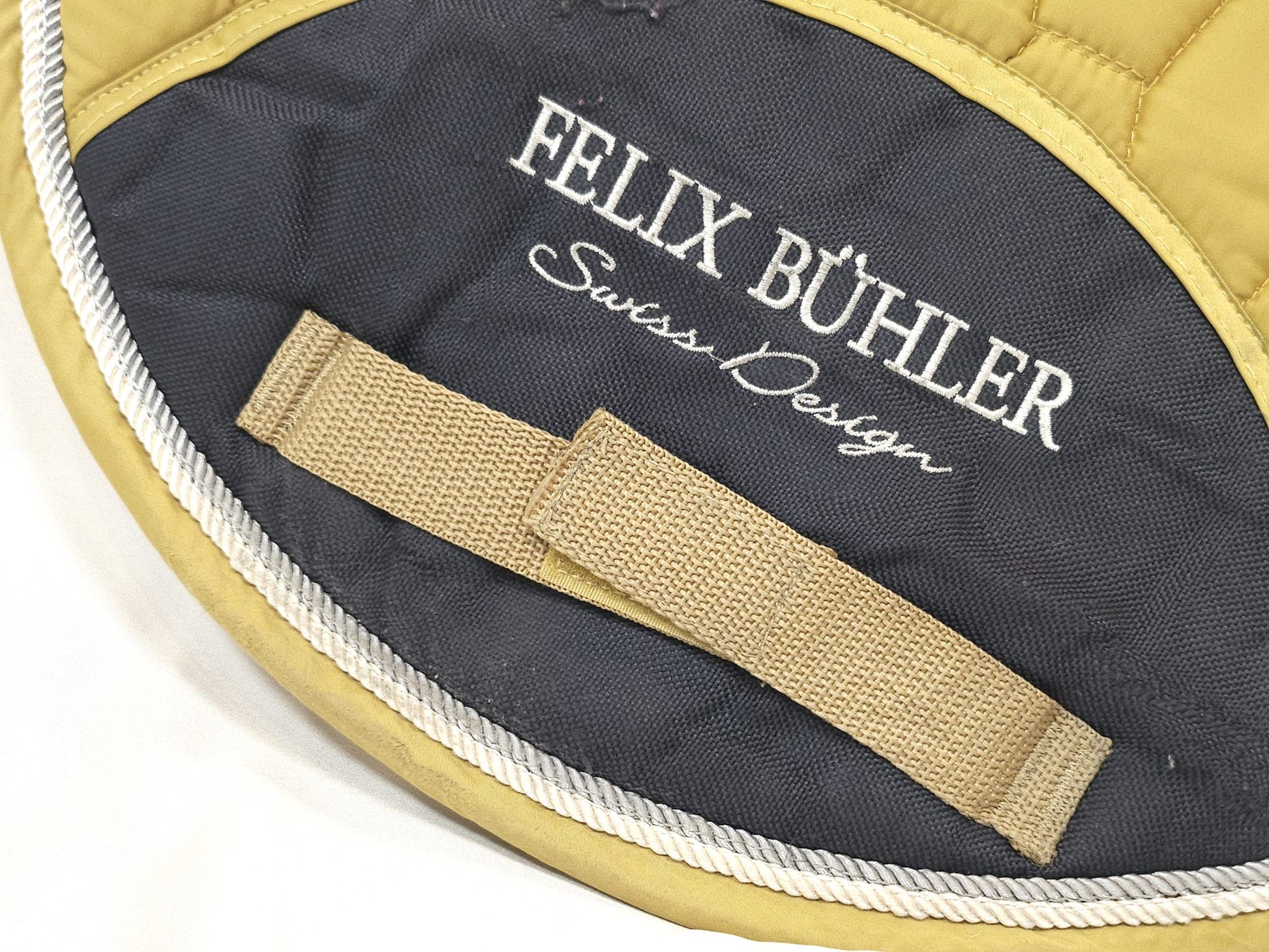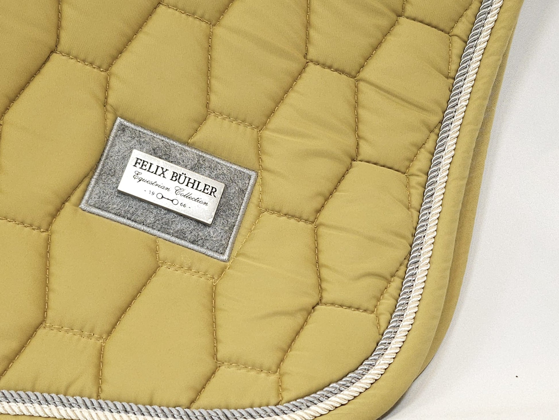 Edle Schabracke von Felix Bühler in gelber Farbe. Weiße und silberne Kordel. VS